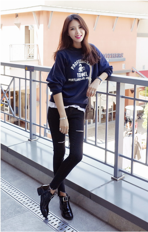 字母卫衣+白Tee+黑色紧身牛仔裤+短靴