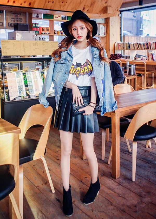 推荐理由:牛仔外套的粗线条与皮裙的光亮感,形成面料色泽的对比,为整体带来了时尚度。黑色的百褶的款式不仅性感神秘,而且增加了几分小女人的清纯。而且皮裙现在正是流行之际,赶时髦的MM们大可去淘上一件。