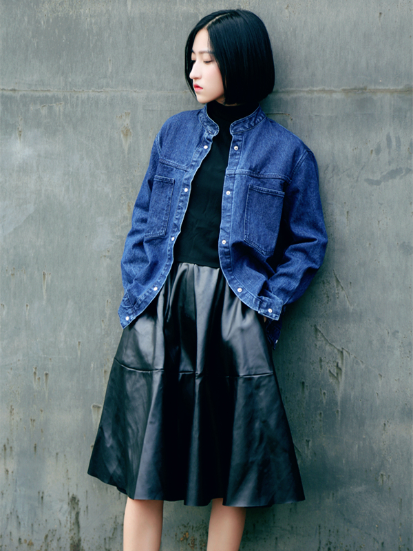No.1 牛仔外套搭配皮裙