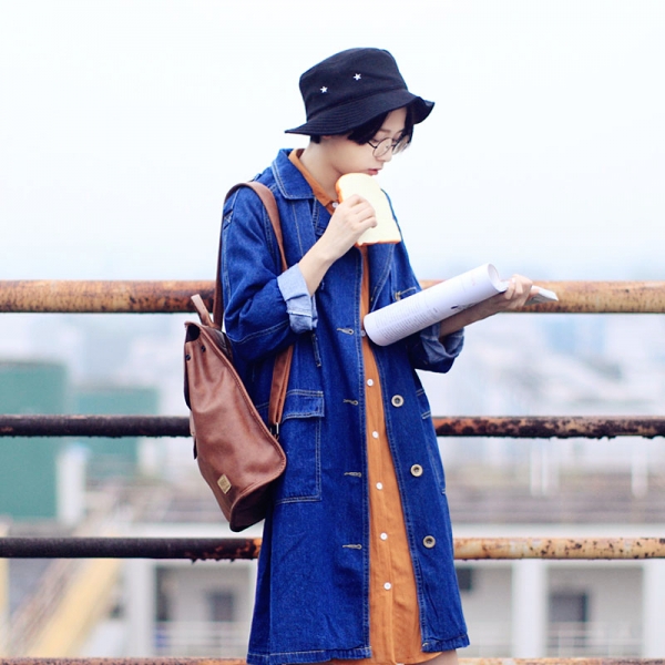 推荐理由:长款牛仔外套搭配衬衫裙,这一对斯文组合,也受到许多潮女们的欢迎。朴素无华的扣子整齐排布,两者相互呼应,显得文艺范十足,衬衫裙的领口则很好的修饰颈部,增加了立体感。
