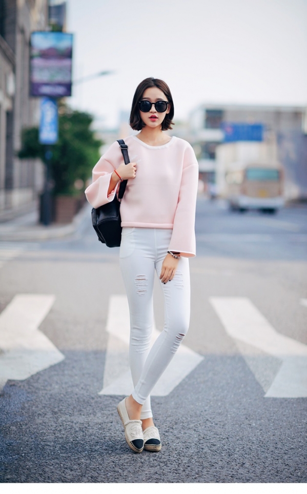 粉色卫衣+水洗白破洞打底裤+拼色乐福
