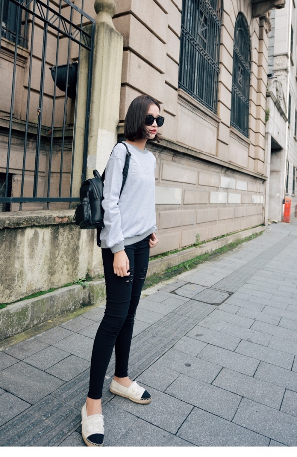 灰色套头卫衣+黑色破洞裤+拼接乐福鞋+黑色背包