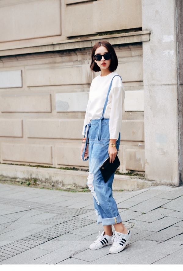 白色卫衣+破洞牛仔背带裤+运动鞋