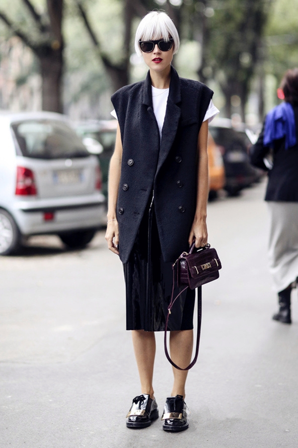 中性穿搭 style1:马甲外套+黑色皮裙+镶金属皮鞋+短发
