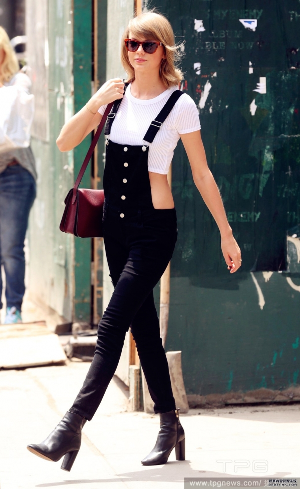 中性穿搭 style4:背带裤+露脐上衣+黑色皮靴+挎包