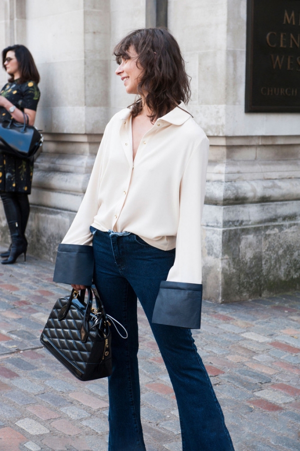 坐在办公室的姑娘们总是因为坐的太久腿部水肿,这时一条喇叭裤是最好的选择。喇叭裤搭配上尖头高跟,你可以拥有修长的腿部线条,也不会因为腿部过于的束缚而感觉到难受。千万记得穿喇叭裤就要把衬衫扎进裤子里哦,不然会略显拖沓。