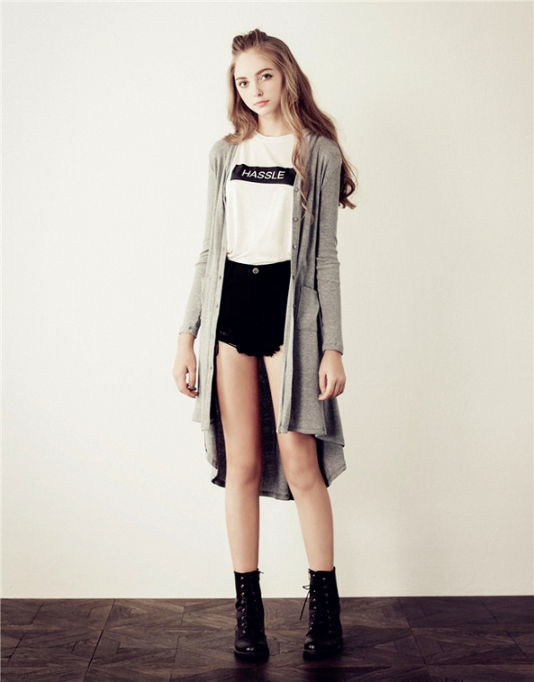 时尚看点:对于长款开衫来说,T恤面料的细腻柔软,能够与之形成对比或互补,比较适合贴身穿着。T恤的种类颇为丰富,像当下流行的条纹tee ,格纹tee,纯白tee等衣服都非常百搭时尚,与铅笔裤或高腰短裤组成上下搭配,照样能秀出好身材。