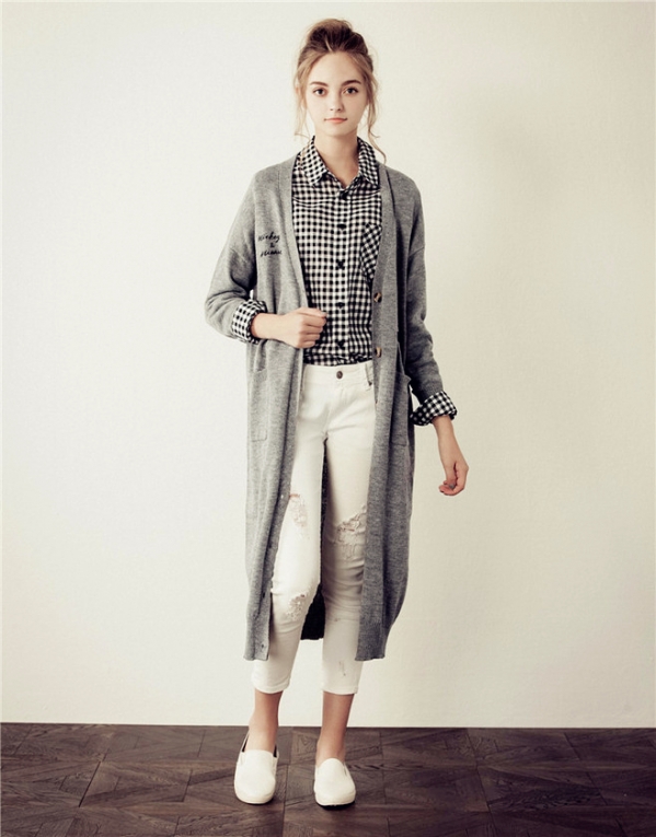 LOOK7 长款开衫+格子衬衫+破洞七分裤