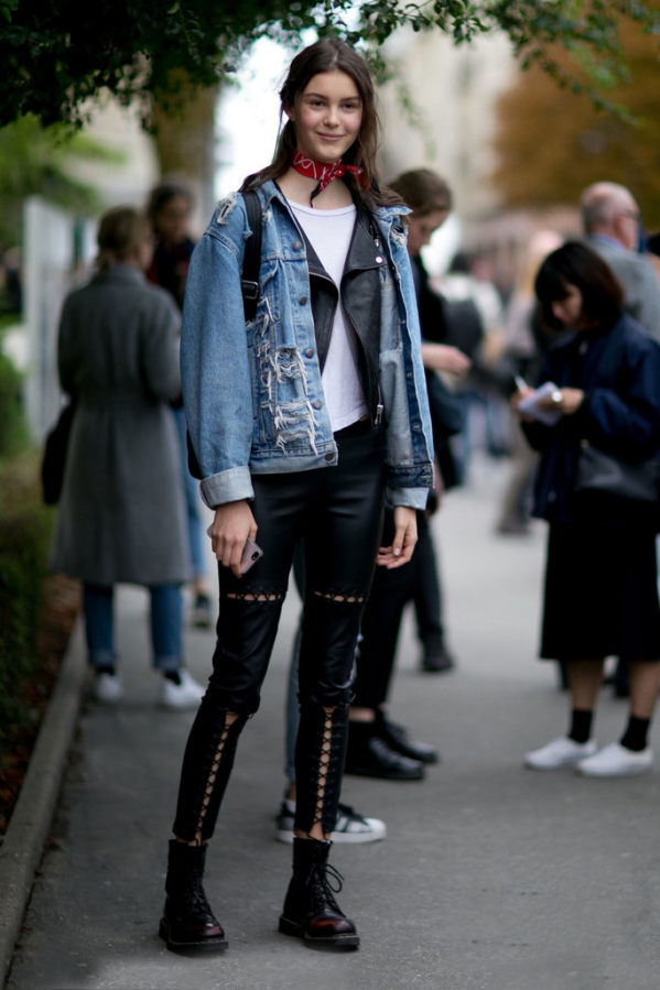 牛仔外套+皮背心+白色内衬+黑色皮裤+马丁靴