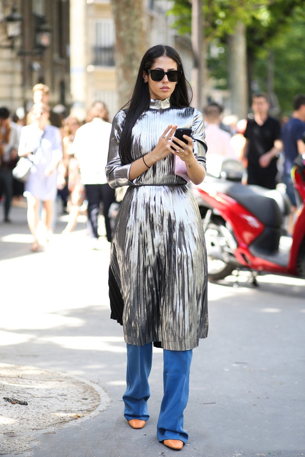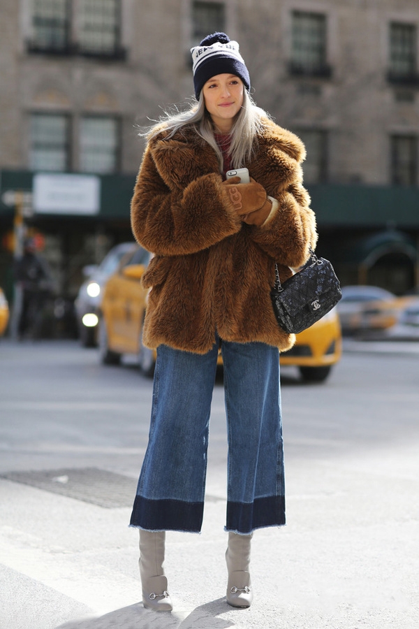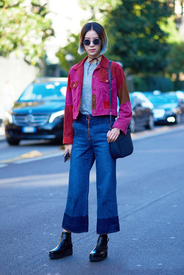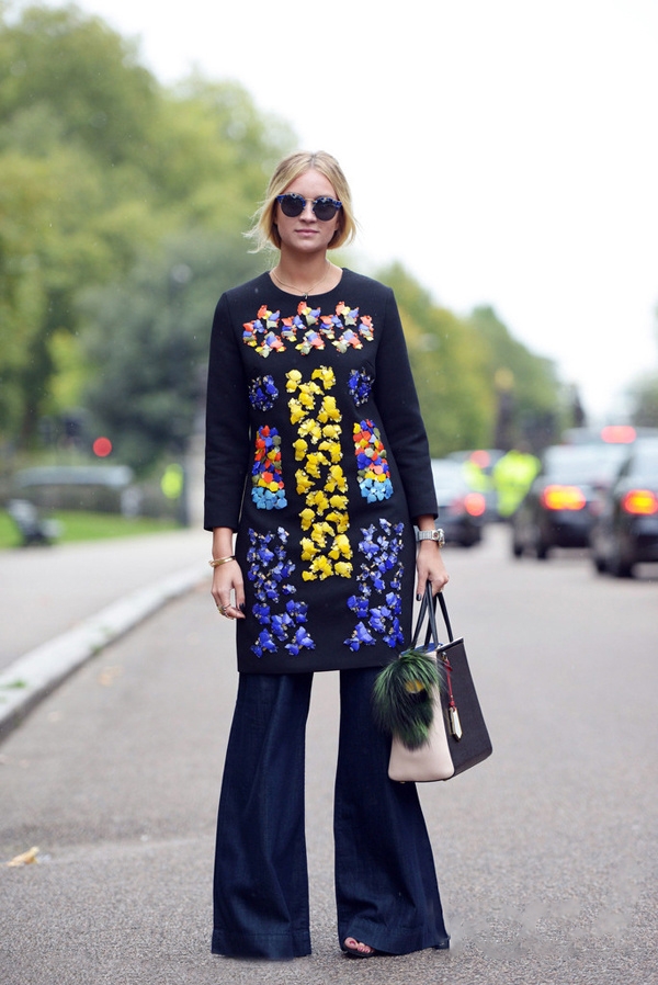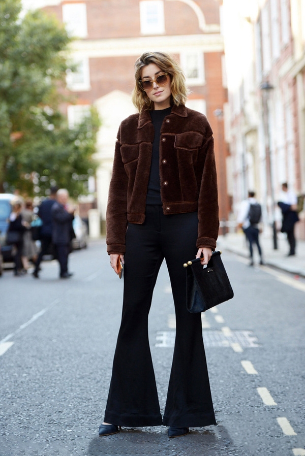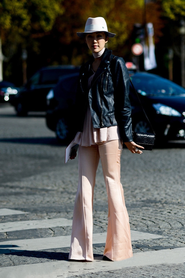 牛仔质地的喇叭裤是街拍里的老熟人,它的设计比普通牛仔裤版型都要长推荐搭配超高高跟鞋, 让你在无形中增高。