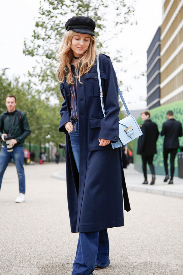 时尚看点:喇叭裤在近两年又有了回潮之势,不如抓住流行趋势,淘上一条喇叭裤子吧。这件宝蓝色的呢子大衣与牛仔喇叭裤的色彩也极为和谐,浅蓝色的牛仔裤,上窄下宽的设计,突显出些许叛逆,也带来几分时髦感。