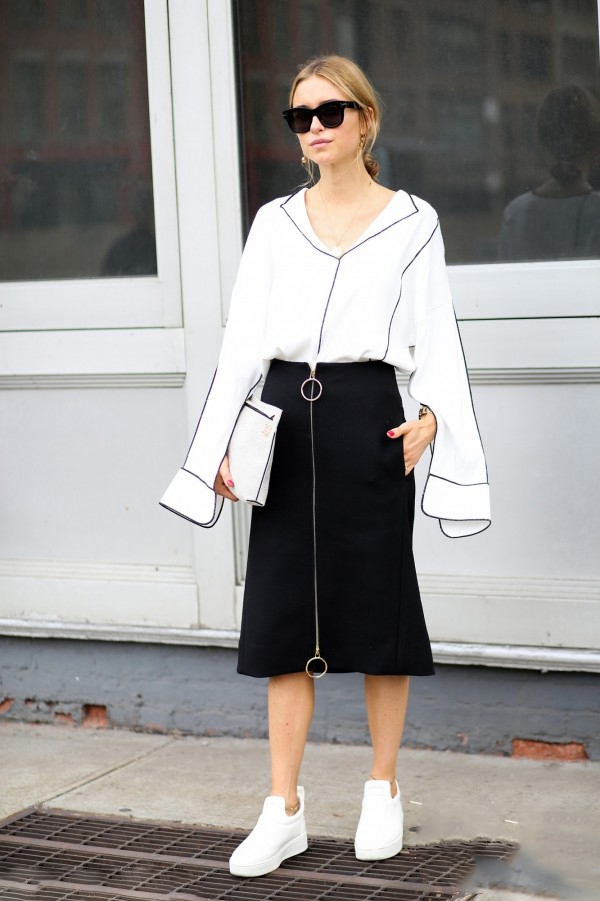 极具造型感的白衬衫配上拉链包裙,摩登感十足。配色上也是简单的黑白配色,简单利落,是极简主义者的最佳选择。