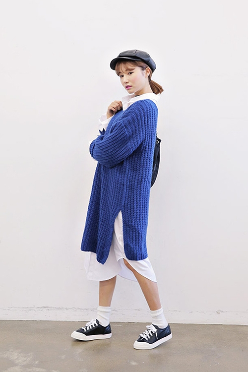 Look4:蓝色长款针织外套+白色衬衫裙+黑色板鞋
