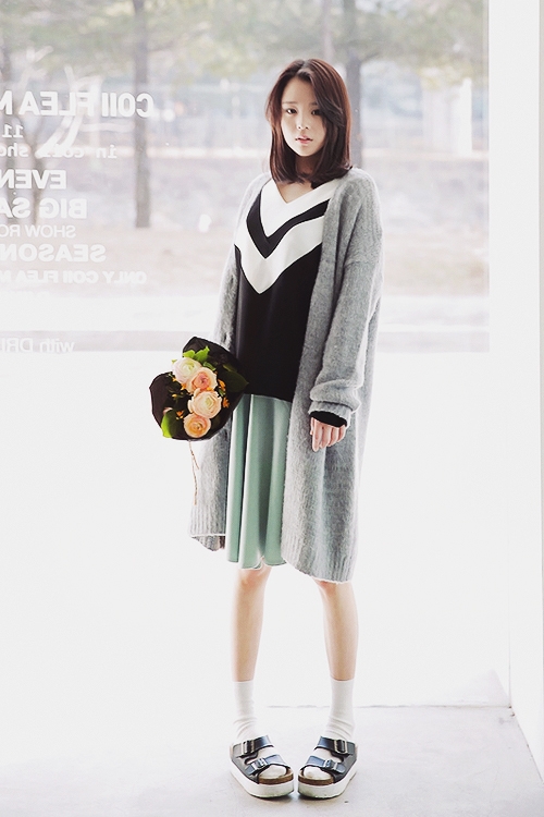这样的穿搭就像是邻家的小女孩一样,本来是黑白灰的原色搭配。加上了薄荷绿以后不显得奇怪,反而变得更加的小清新了。有几分森女的味道,想要穿出文艺范的妹子们不妨也试一试这样的穿法哦。