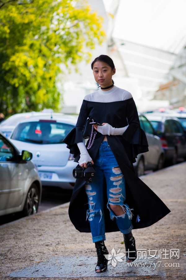 牛仔裤上衣搭配:破洞牛仔裤