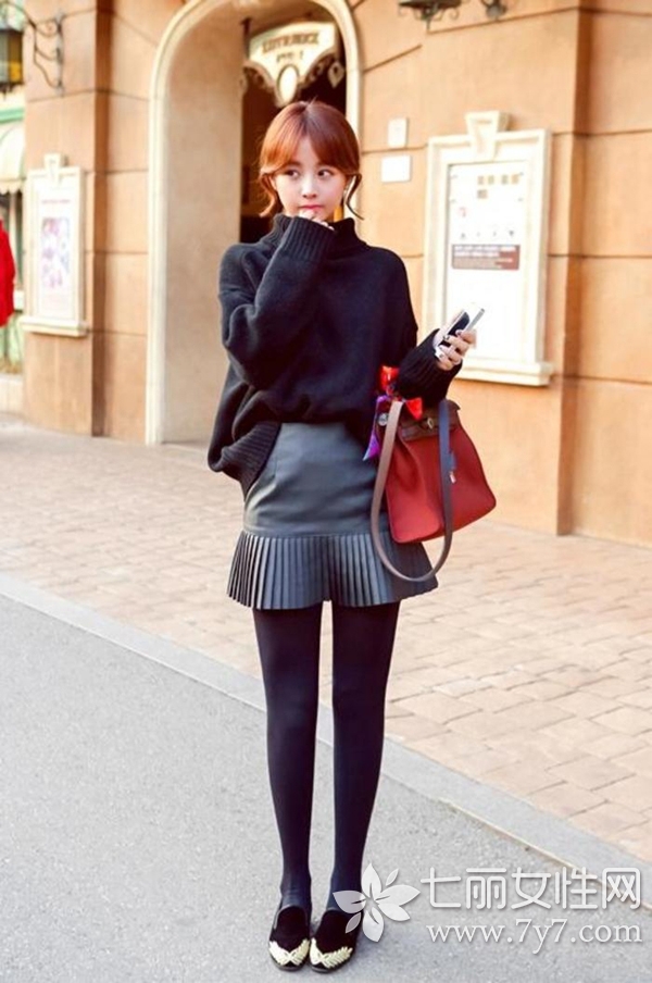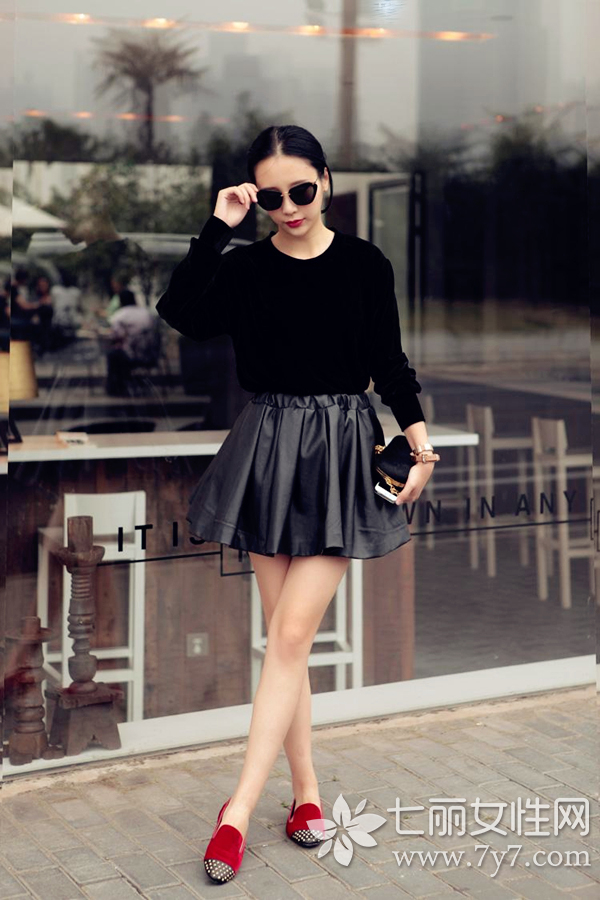 时尚看点:皮裙的另一种流行度超高的款式,也是很多名媛争先抢秀的气质单品,用来搭配黑色毛衣,会比百褶款式少些青涩,多几分女人味,出街再配上一双尖头平底鞋,分分钟美成一道风景。