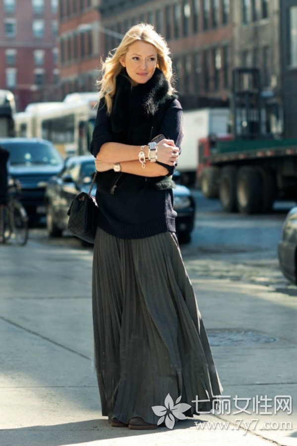 时尚看点:黑色毛衣搭配半长裙倒是极其适合在秋冬季出街扮靓,毕竟挡风也是它的一大优势。穿半长的女生通常给人一种清纯,柔美,优雅的感觉,即使是矗立街头,画风也极其优美动人。深灰色很适合秋冬的服装着色,与黑色毛衣组合,显得低调复古,透漏着别样的时尚感。