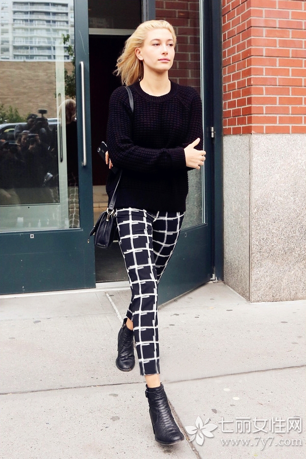 小编点评:黑色毛衣已是最深色系,搭配的长裤,可以选择带些亮点的裤子来消除沉闷感。比如图中经典的格纹裤子,黑白格纹为国际流行元素,给人的视觉冲击感很强,而黑色铅笔款型配上低帮皮靴,显得英伦范十足!