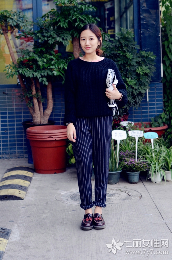 LOOK2 黑色毛衣+条纹休闲裤
