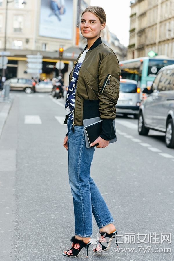 军绿色外套+白色印花卫衣+牛仔裤+黑色皮草饰高跟鞋