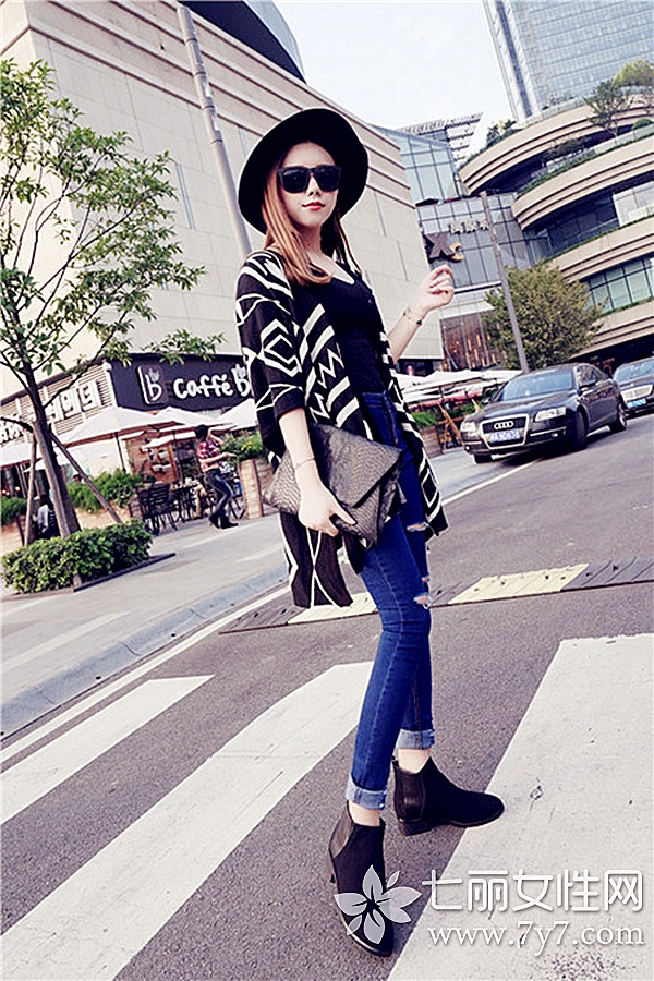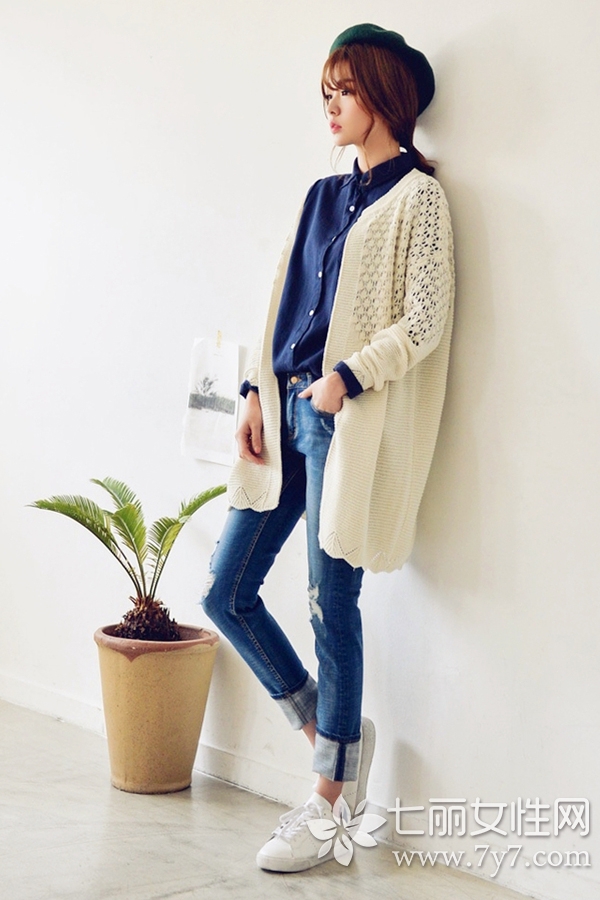 时尚看点:纯色针织开衫是基本款单品,搭配牛仔裤显得非常个性休闲。不过,女生们在牛仔裤的选择上也可以考虑破洞或印章的裤子,能为整体的时尚度加分哦!