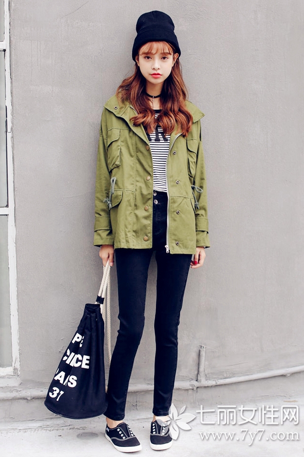 时尚看点:军绿色是许多女潮人溺爱的流行色系,而军绿色外套给人的感觉帅气,清新,搭配铅笔裤型出街不怕不够潮!