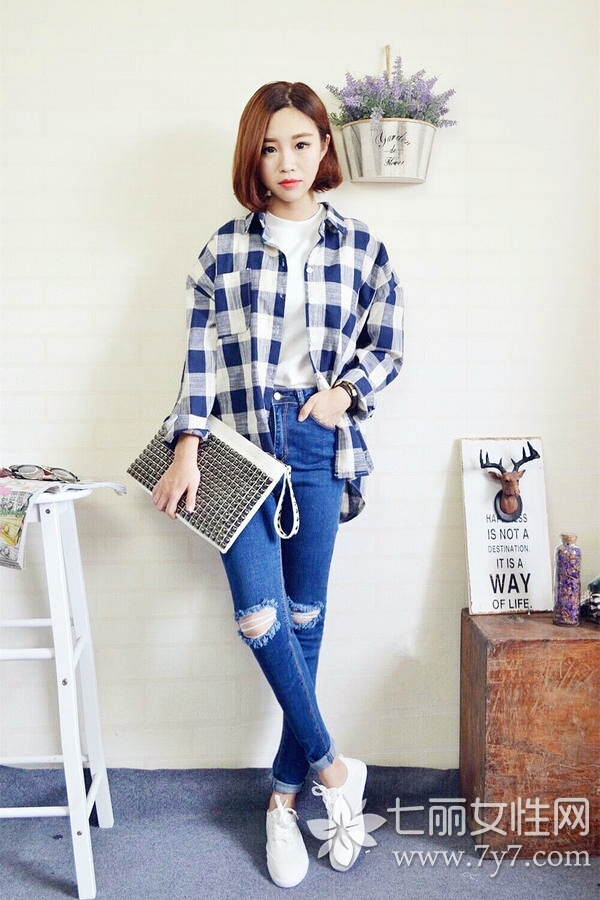 时尚看点:经典的格纹时尚百搭,而铅笔裤的紧致贴身,又赋予青春活力,这非常具有学院气息的搭配千万不能错过哦!