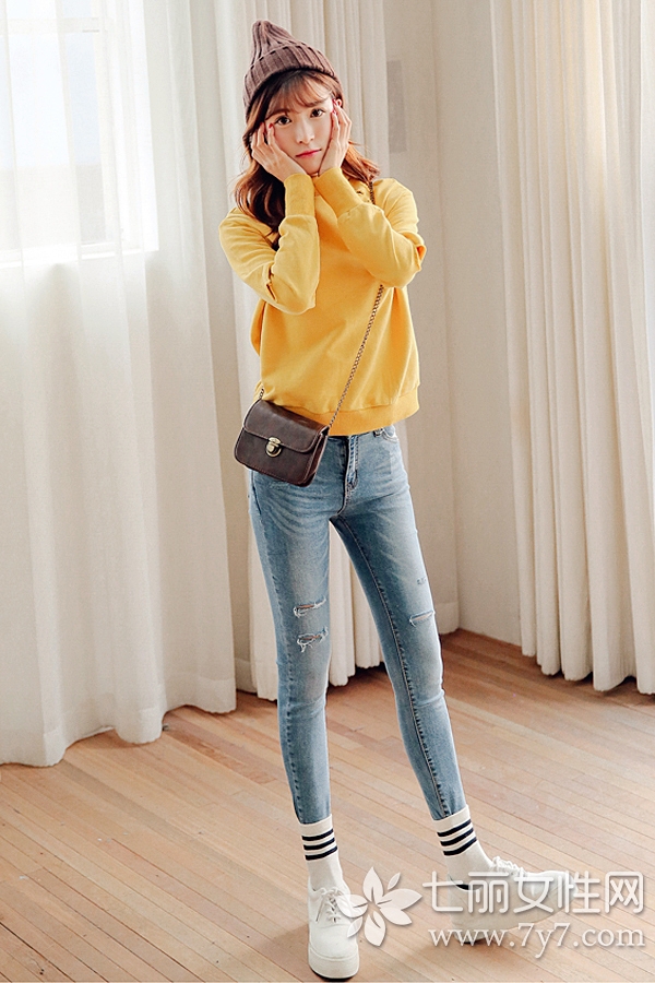 小编点评:牛仔铅笔裤搭配卫衣又是一套充满活力的组合,相对于LOOK2来说,多了些许街头感。搭配上一双休闲板鞋,就别在乎所谓的格局,做个性女潮人就好!