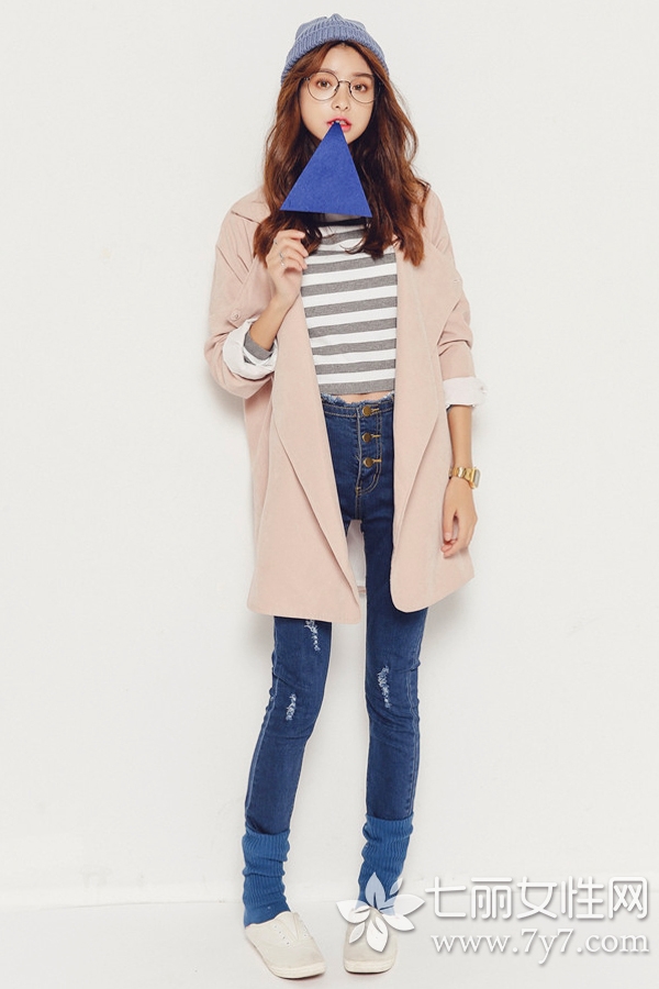 LOOK6 牛仔铅笔裤+风衣外套+条纹针织帽