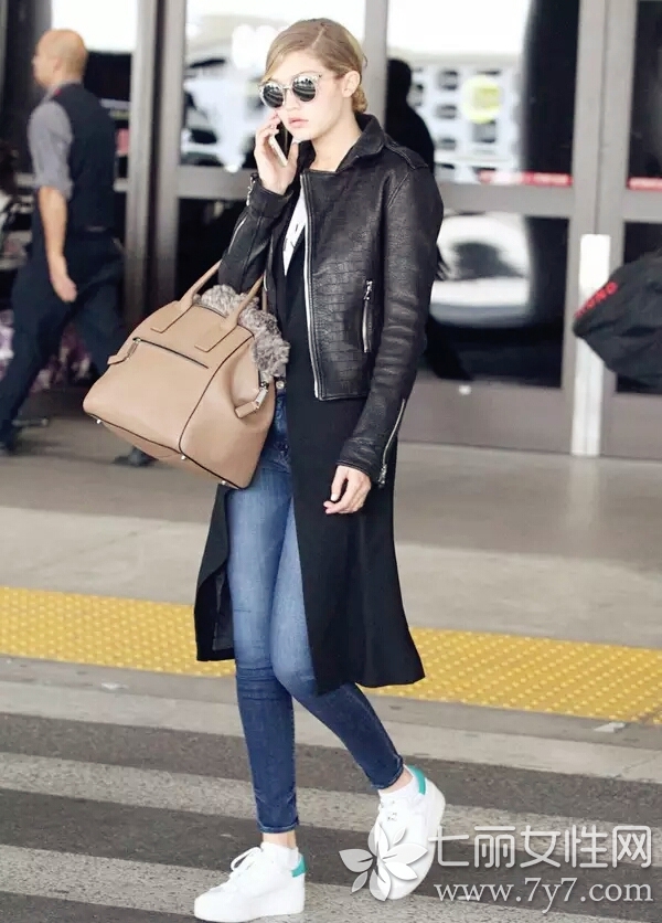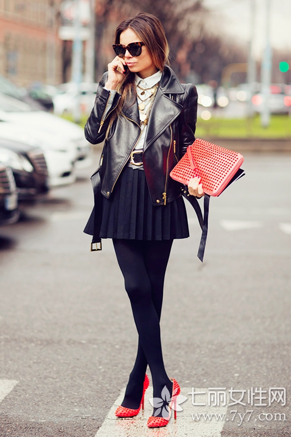 小编点评:皮衣的防风性很好,这种上衣组合在冬季也能穿一段时间,下装搭配高腰百褶裙,视觉上腰线的提高,直接将腿部拉伸了一大截,也可像她那样加宽腰带来突出腰线。配饰的选择上也显得颇有心机,黑红色本来就是对好搭档,而草莓色的鲜亮感,让整体多了几分俏皮可爱,瞬间减龄不少。