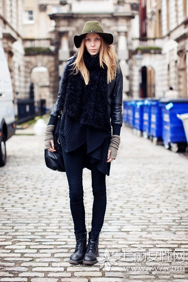 时尚看点:像牛仔铅笔裤这样经典百搭的单品,每个女生应该都备有一两条,像图中达人那样搭配皮衣和皮靴,偶尔做做帅气的个性女孩吧!