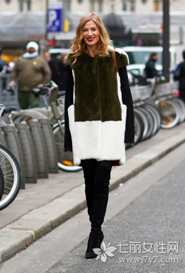 时尚女装搭配一:毛绒外套+长靴+铅笔裤