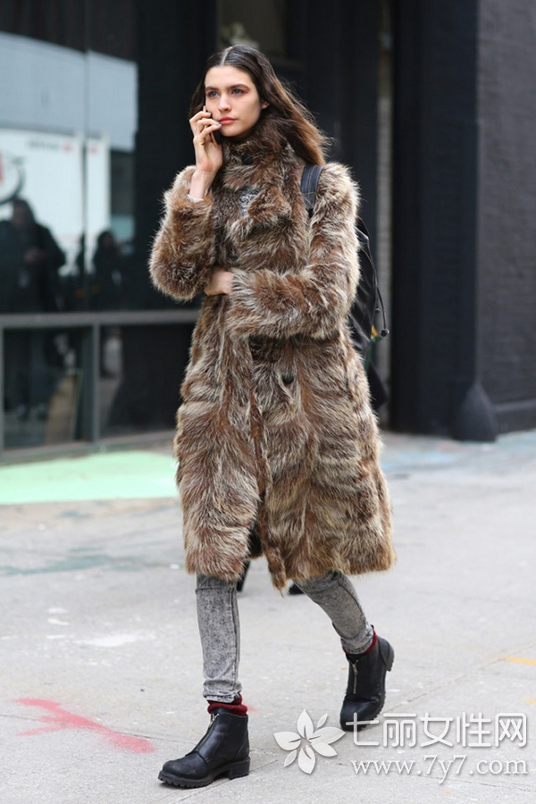 时尚女装搭配二:长款毛绒外套+牛仔铅笔裤+低帮皮靴+双肩包