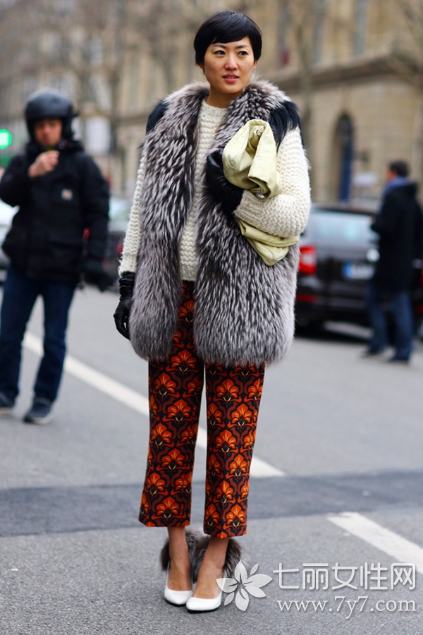 时尚看点:毛绒马甲的款式流露出独特的时尚感,手臂的解放会让臃肿感转移不少。马甲像这样内搭毛衣也可以很保暖,再配上抢眼的印花七分裤,显得很有摩登范。