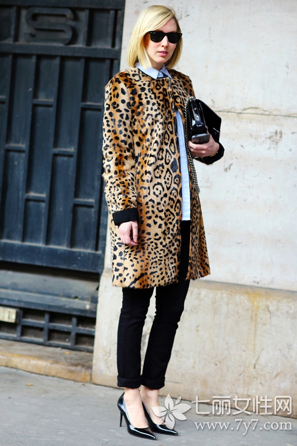 时尚女装搭配四:豹纹毛绒外套+衬衫内搭+黑色休闲裤+尖头高跟鞋+链条包