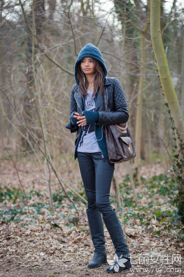 黑色皮衣+灰色内衬+蓝色连帽衫+黑色高筒靴