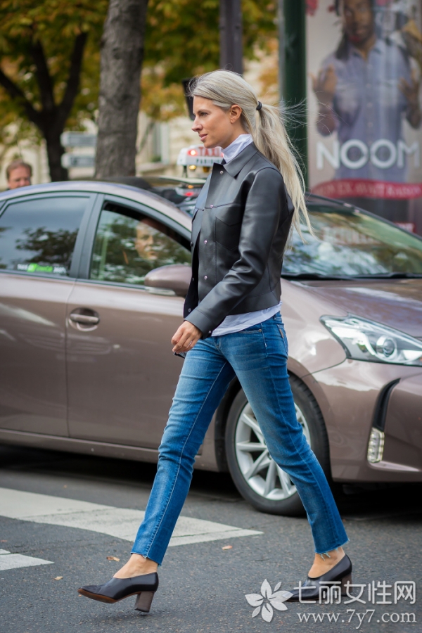 黑色皮衣+白色衬衫+毛边牛仔裤+粗跟高跟鞋