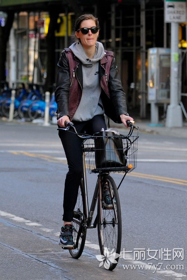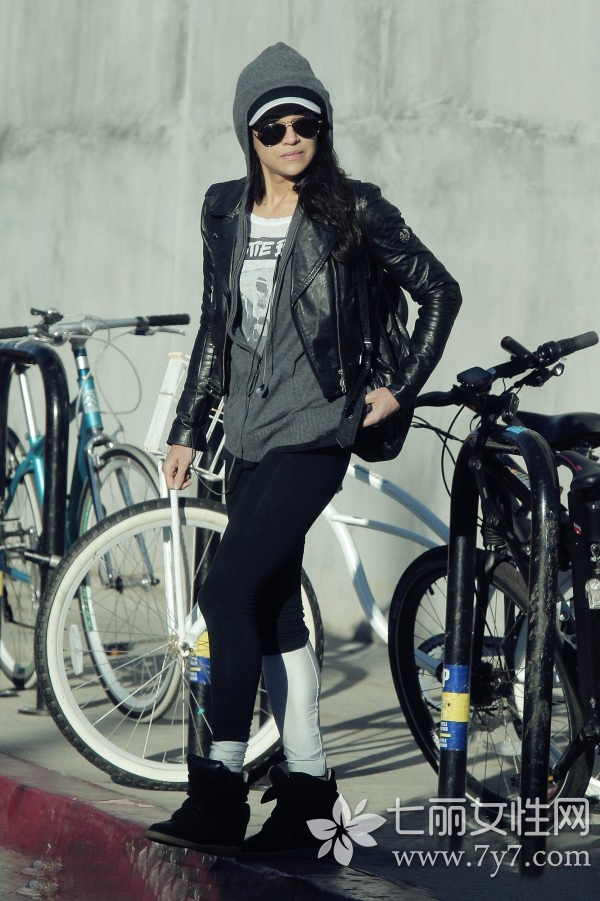 何穗最新街拍,灰色毛衣+墨绿色光泽感半裙,文艺慵懒,少女感十足。马海毛毛衣来自H&M,手提包和粉色毛拖鞋均来自Gucci,半裙来自Tibi 2016