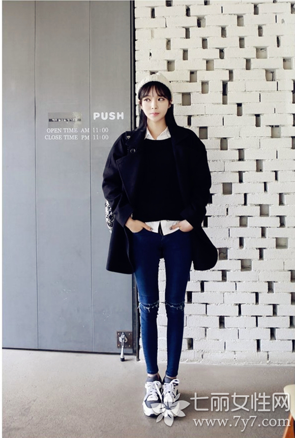 搭配LOOK3:黑色毛呢大衣+假两件组合+破洞牛仔铅笔裤+球鞋+针织帽