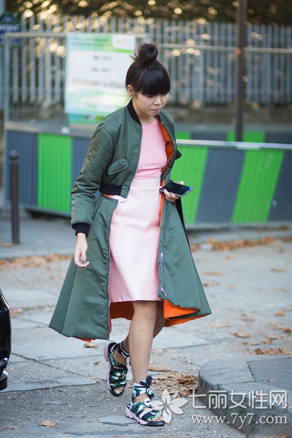 时尚看点:棉料的服装穿在身上既保暖又轻巧,非常适合冬季出街游玩穿着。图中的绿色长款棉衣与裸色套装的内外搭配,看起来十分低调休闲,而susie又利用迷彩的鞋子,为整体增加了亮点。