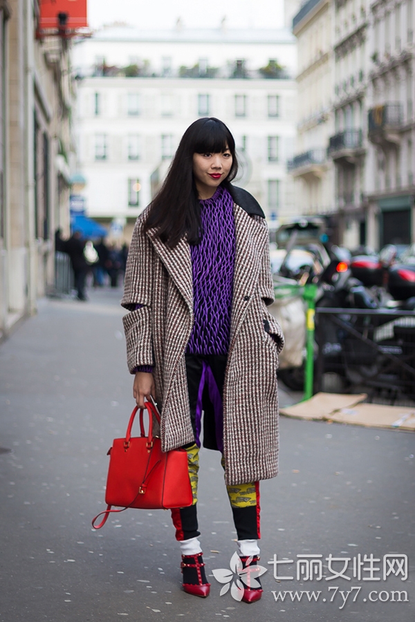 LOOK3 呢大衣+紫色毛衣+撞色针织裤+尖头高跟鞋+橙红色手包
