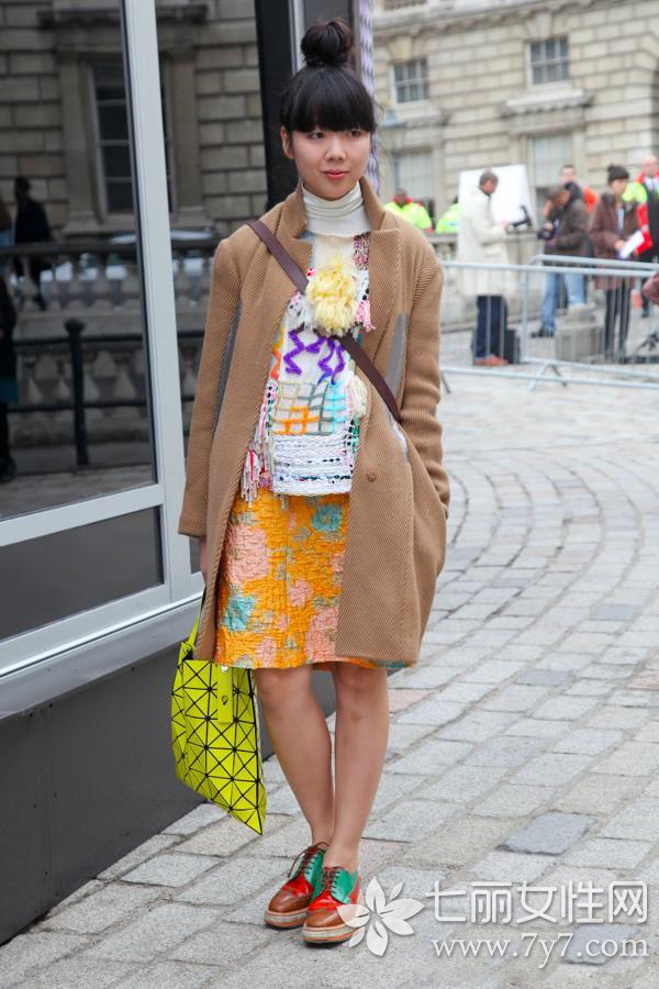 LOOK7 印花呢大衣+长裙内搭+双肩包+休闲鞋