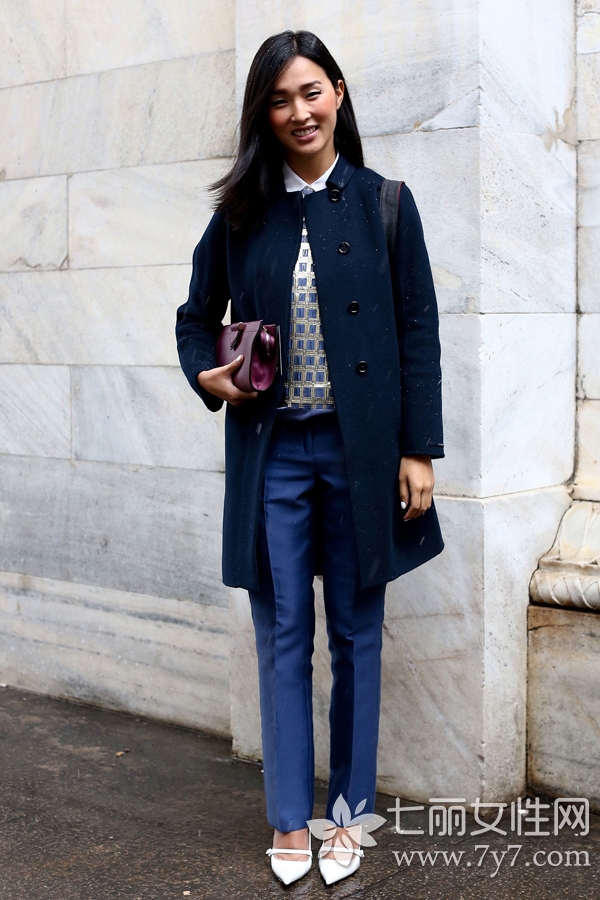 时尚看点:深蓝色呢大衣在银色内搭的衬托下,沉闷感减少大半,白色衬衫领口的颈部修饰,也多了一丝清爽感。下搭藏蓝色休闲裤,干净细腻的视觉感受区别于呢衣外套,多了几分低调素雅,白色的尖头皮鞋则颇有心机的转移掉整体的厚重感。