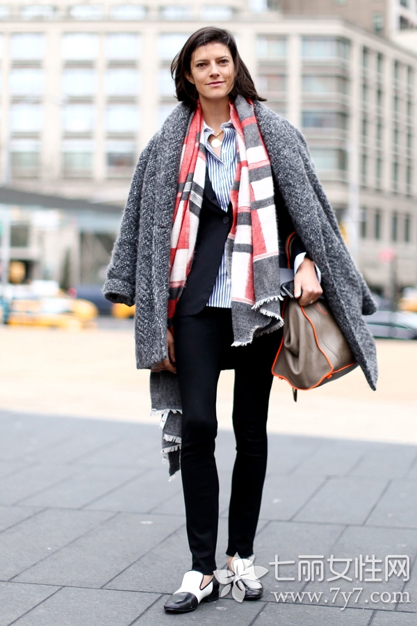 LOOK3 毛呢大衣外套+条纹衬衫+铅笔裤+围巾+水桶包+撞色皮鞋