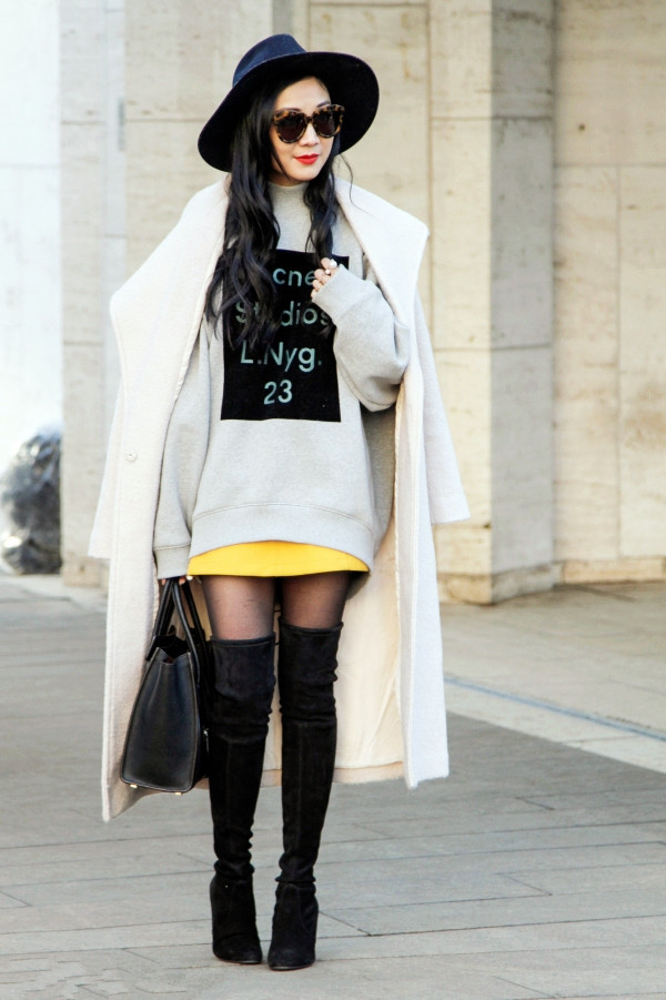 style 4:过膝长靴+卫衣+呢大衣