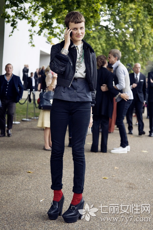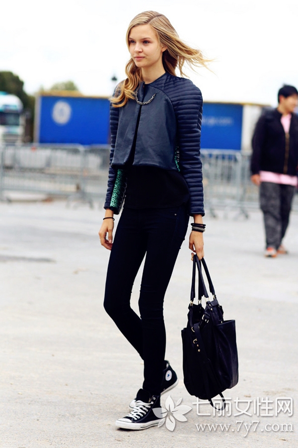 小编点评:女生偶尔扮帅,也别有一番味道,像黑色皮衣搭配铅笔裤就是既青春又时尚的组合。整洁利落的黑色铅笔裤让女生腿部显得性感纤细,再配上休闲球鞋或双肩包,狂街游玩的好搭当。