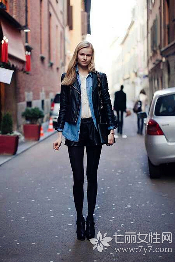 小编点评:皮质与皮质的组合当然是无可挑剔的组合,但想要穿得有个性,则需要结合其它单品来修饰。比如,图中的达人就利用牛仔衬衫,和白衬衫做层次搭配,这样既分割了色块,又显得丰富时髦,下身搭配皮短裤后性感又吸睛,一条黑色裤袜御寒的同时,更显得女生腿部纤细。
