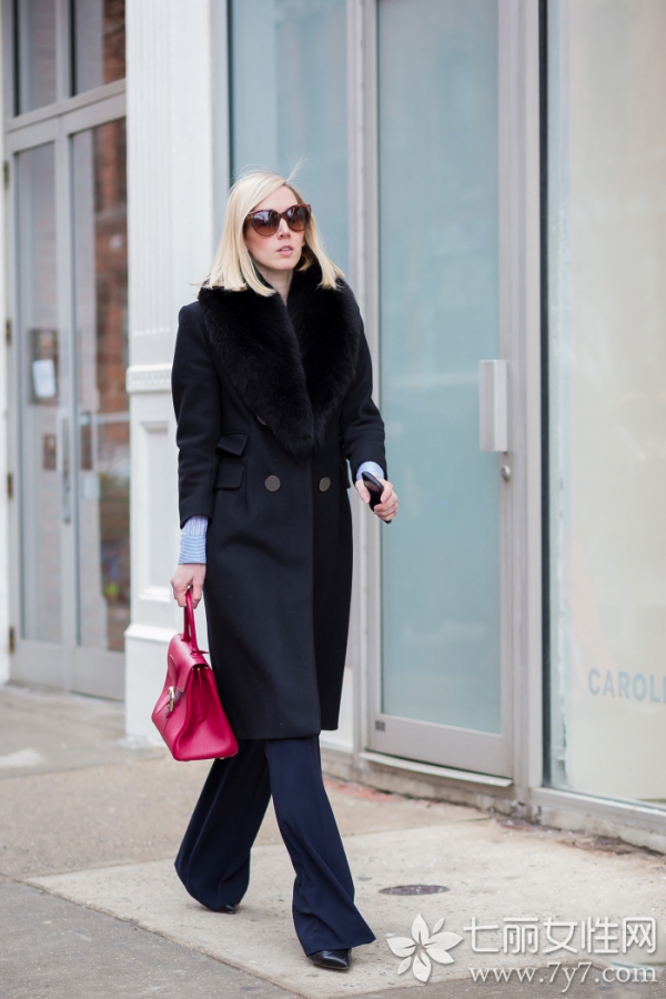 除了皮草大衣皮草家族今年有一位成员崛起了,它就是皮草装饰大衣。这类大衣没有皮草大衣那种毛茸茸的质感,用料少两种不同的面料交错到一起营造了更加好的视觉效果。这类大衣的搭配没有那么多禁忌,牛仔裤或是阔腿裤都是不错的搭配想法。