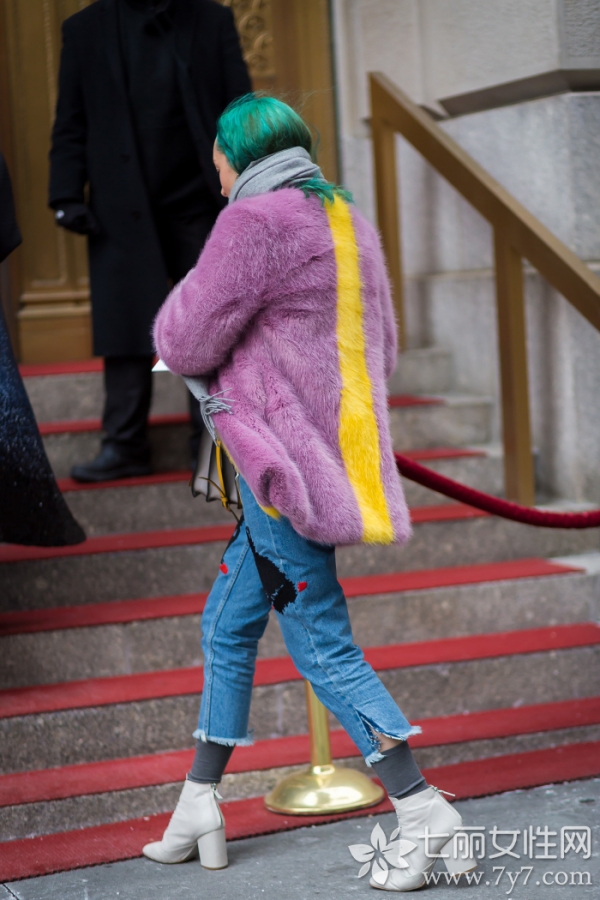 何穗最新街拍,灰色毛衣+墨绿色光泽感半裙,文艺慵懒,少女感十足。马海毛毛衣来自H&M,手提包和粉色毛拖鞋均来自Gucci,半裙来自Tibi 2016