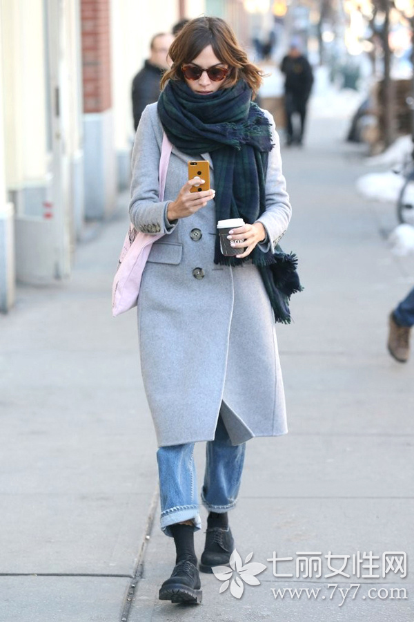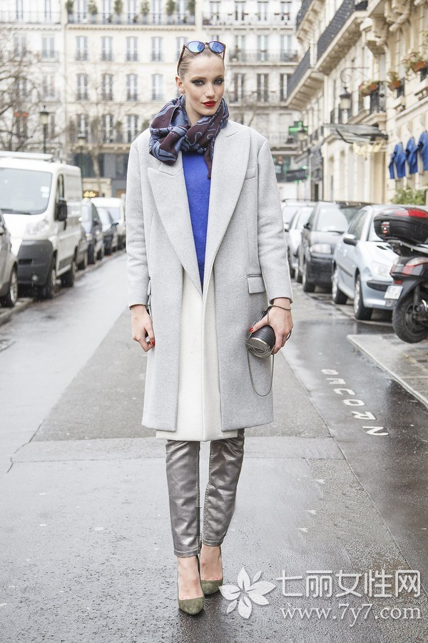 小编点评:灰色属于百搭色,与大部分颜色组合都会不觉得过分。图中的浅灰色毛呢大衣搭配蓝色内搭,也能hold住,露出的蓝色部分成为了整体的焦点,而红色印花围巾与蓝色毛衣的撞色搭配造成的跳跃感,则让时尚意味更浓。